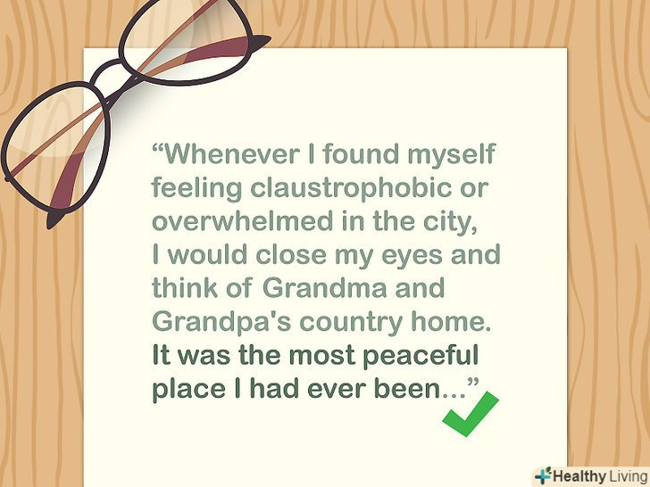 Задійте сенсорні деталі, щоб передати запах, звук, відчуття. Дозвольте читачеві відчути, ніби він дійсно знаходиться в цьому місці, відчуває вітер на своєму обличчі, чує бродячих собак і проїжджаючі автомобілі. Який тут запах? На що людина кине свій погляд? Що почує?[13]- Наприклад, напишіть: "він марно намагався згадати, коли в будинку в останній раз було тихо. Хто - небудь завжди спускався або піднімався по сходах у важкому взутті, відкривав холодильник, голосно дивився футбол по телевізору або криком просив вимкнути музику».
