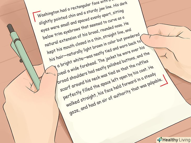 Додайте завершальні штрихи для повноти картини.переконайтеся, що читач зможе скласти уявлення про найбільш важливі риси зовнішності людини. Постарайтеся торкнутися хоча б самі основні аспекти статури та одягу, а також особи, так як ці деталі представляють найбільший інтерес для читача. Продовжуйте використовувати влучні описові слова і не забувайте знаходити оригінальні рішення.[4]- Наприклад, описати обличчя можна так: "незначна кривизна її носа і передніх зубів відразу кидалася в очі. Доповнювали картину довге волосся, які вона то укладала вперед, то знову ховала за спину, а також постійно моргають очі, які ніби не розуміли, як вони опинилися тут».