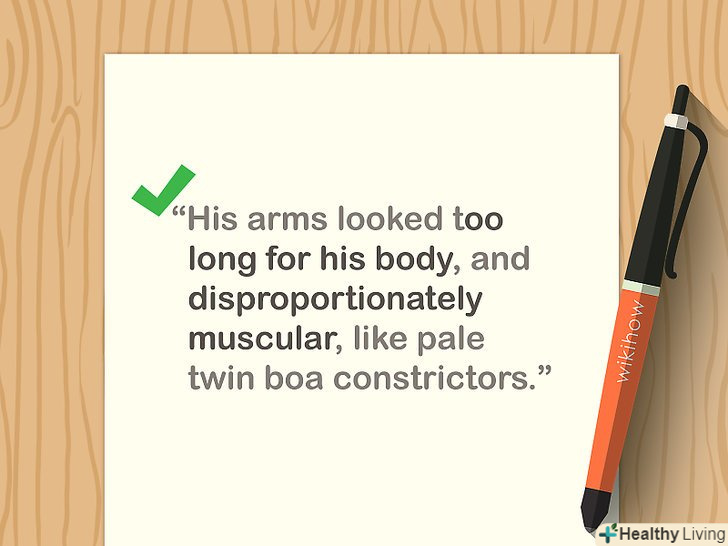 Використовуйте образну мову і влучні прикметники.метафори, порівняння і запам'ятовуються описові слова допомагають зобразити людину і зберегти читацький інтерес. Потрібно відтворити дух і зовнішність персонажа без зайвої багатослівності. У цьому Вам допоможуть влучні і грамотно підібрані слова і фрази. Постарайтеся використовувати фрази, яких ви ніколи не зустрічали раніше, або звичні слова в незвичайному сенсі, щоб розкрити невідомі грані людини або персонажа.Образна мова