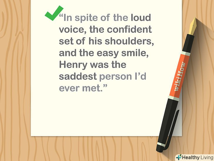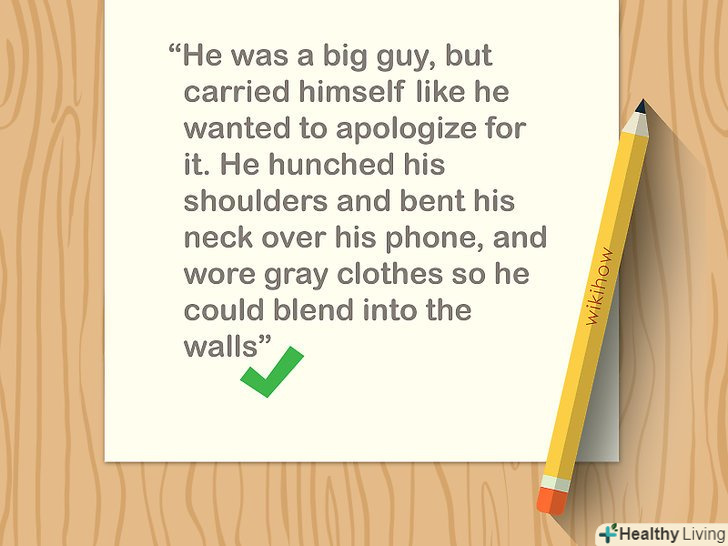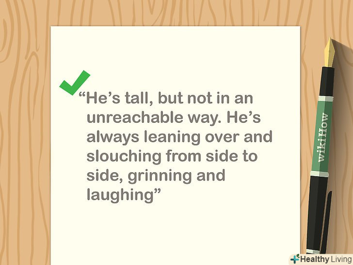 Зосередьтеся на аспектах зовнішності, які дають уявлення про характер людини.правильний вибір описових слів дозволяє створити наочний образ і при цьому показати читачеві внутрішню суть людини. Знаходьте вагомі і звучні слова, які дозволять чітко викласти думку і задати необхідний тон.[3]Як показати характер за допомогою опису зовнішності