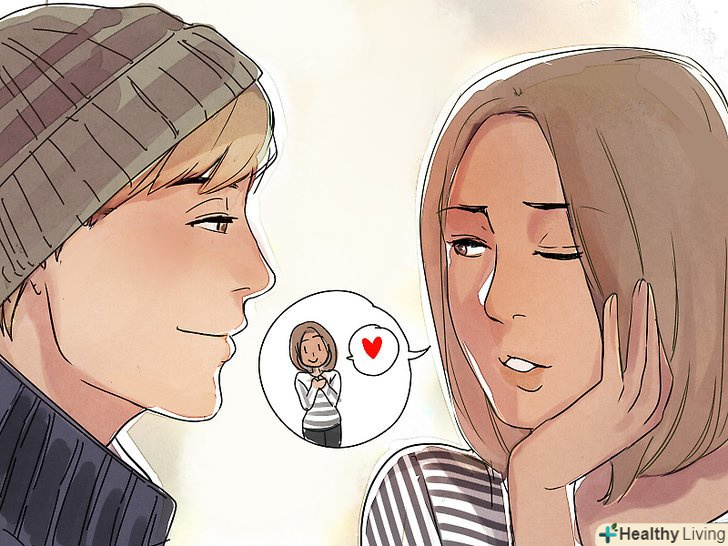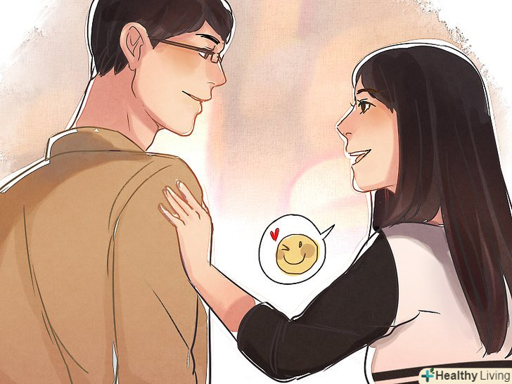 Спробуйте трохиПофліртувати . дізнавшись хлопця трохи ближче, можна спробувати легкий флірт. Так ви проявите свій інтерес і зможете оцінити, наскільки хлопець відповідає вам взаємністю. Флірт у відповідь підтвердить його інтерес. [9]- Посміхайтеся. Посмішка заразлива. При цьому не забувайте дивитися в очі, щоб підтримати приємну атмосферу флірту. Ваша посмішка мотивує хлопця домагатися вашого розташування. Побіжно посміхніться йому, а потім відведіть погляд убік.