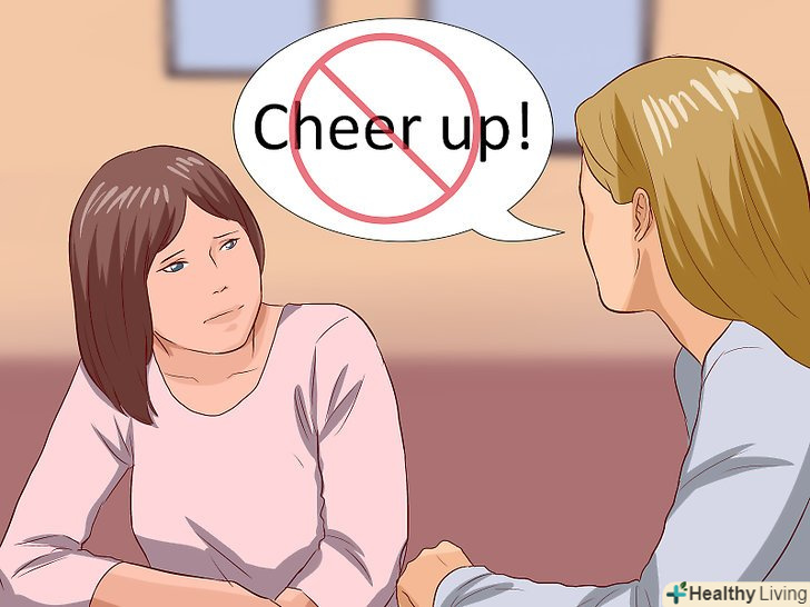 Дозвольте другу сумувати. Не потрібно говорити такі фрази: «Ти повинен підбадьоритися». Це чи не найгірше, що ви можете сказати засмученому людині, особливо якщо він бореться з депресією і тривожністю одночасно. Вимовляючи таку фразу, ви говорите людині перестати сумувати. Якщо ви попросите когось перестати сумувати, це буде відображенням ваших почуттів (вам погано, тому що одному погано), а не почуттів одного. Ви фактично скажете, що ваше відчуття дискомфорту через його смуток важливіше, ніж його горе. Якщо ви справжній друг, вам не слід робити цього. Дозвольте своєму другові сумувати, якщо він відчуває такі почуття. [8]- Не потрібно говорити людині, що він повинен відчувати, а що ні; кожна людина має право на почуття і вираження емоцій.