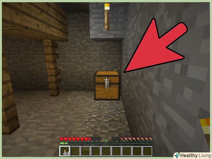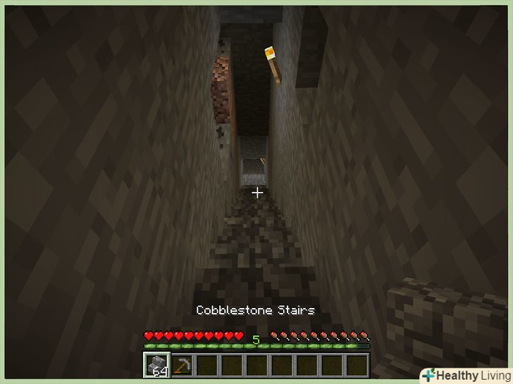 Зробіть Сходи вниз. зробіть дірку в землі розміром в 3 блоки. Потім викопайте сходи так, щоб з одного блоку можна було перейти на інший рівнем нижче. Час від часу потрібно повертатися на поверхню, їсти, складати свої знахідки в скриню і міняти інструменти і зброю.