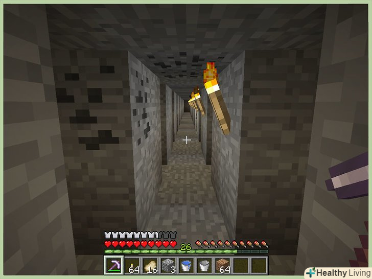 Копайте за певною схемою. їх існує кілька штук. Наприклад:- Зробіть одну шахту 2 блоки висотою і 1 блок шириною, прокопайте її на кілька десятків блоків вперед. Тепер викопайте рукава, відгалуження - через кожні 5 блоків, уздовж головної шахти. Рукава повинні бути розміром 2х2.