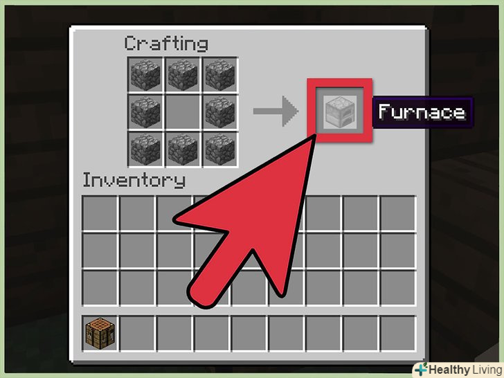 Створіть або знайдіть піч. її можна знайти в селі або створити за допомогою 8 блоків кругляка. Покладіть бруківку на верстак на 8 крайніх осередків, утворюючи порожній квадрат.