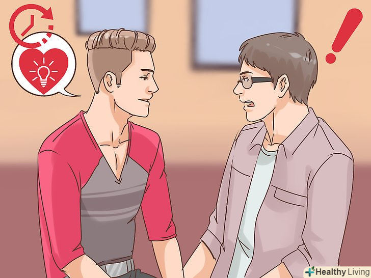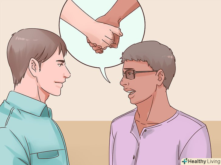 Поспостерігайте за відносинами з одним. після того як ви зізнаєтеся одному в тому, що Ви гей, деякий час уважно поспостерігайте за його поведінкою у вашій присутності. Майте на увазі, що його початкові дії по відношенню до вас, можливо, не відображатимуть справжніх почуттів, особливо якщо ваше визнання його приголомшило. Зачекайте кілька тижнів або місяців, перш ніж зробити наступний крок.- Слідкуйте за його мовою тіла . Якщо друг схиляється до вас, посміхається або навіть фліртує з вами, можливо, він відповість взаємністю на ваші почуття. [6] і навпаки, якщо ви помітите, що він відхиляється від вас або не дивиться вам в очі, ймовірно, він все ще звикається з думкою, що ви гей. Можна почекати, поки він освоїться, або ж взагалі нічого йому не говорити.
