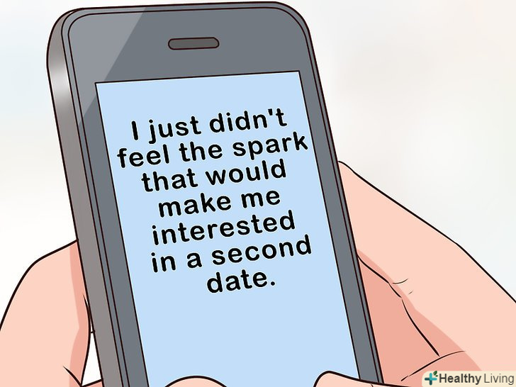 Спочатку зробіть йому комплімент. можливо, повідомлення буде єдиним способом зв'язку, якщо ви познайомилися на сайті знайомств, проте проявіть до людини особливу увагу і спочатку зробіть комплімент. Часом складно передати свій тон в листуванні. Якщо спочатку ви відпустите комплімент, повідомлення не буде звучати різко. [7]- Наприклад, можна написати: "мені сподобалася наша зустріч минулого тижня! Ти-дивовижний мандрівник. Однак я просто не відчула іскри, яка викликала б у мене бажання сходити на друге побачення».