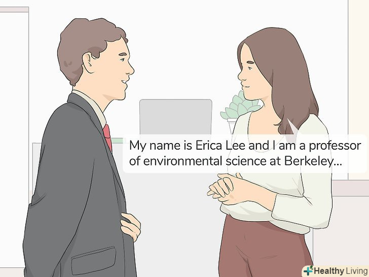 Одним реченням опишіть те, чим ви займаєтеся. якщо ви перебуваєте на діловій зустрічі, швидше за все, ви розповісте кільком людям про те, чим ви займаєтеся. Отже, що ви зробите, коли новий знайомий запитає вас: "чим ви займаєтеся?"Ймовірно, ви почнете 5-10 хвилин розповідати про свою кар'єру. Чи є у вас бажання читати список своїх досягнень? Швидше за все, ні. Якщо у вас не планується серйозна розмова, ви можете просто одним реченням описати суть своєї професійної діяльності, донісши до співрозмовника наступну інформацію: [5]- Хто ви за професією? Вчитель, менеджер, медичний працівник?