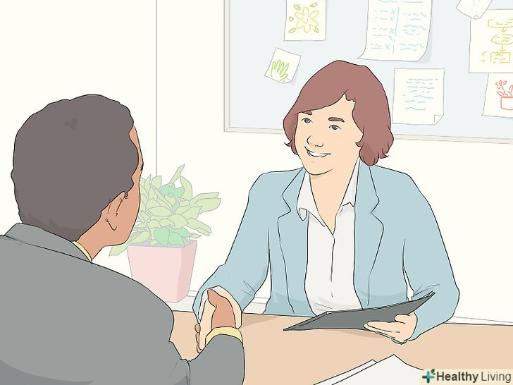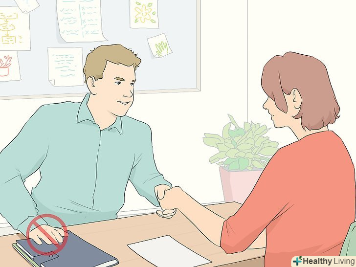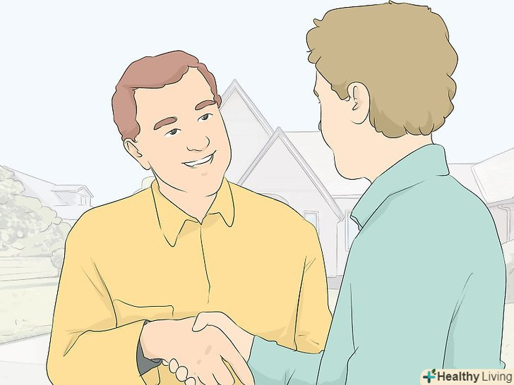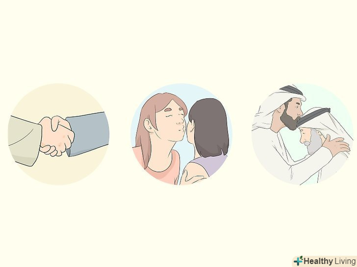 Будьте готовіПотиснути один одному руки або привітати знайомого якось по-іншому. у більшості культур заведено вітати людину, супроводжуючи вітання фізичним контактом. У багатьох країнах і культурах це звичайне рукостискання. Слідкуйте за тим, щоб рука була в міру твердою, вона не повинна висіти, як ганчірка, і не повинна переламати кістки вашому знайомому при рукостисканні.- Дізнайтеся більше про традиції різних культур і країн. Наприклад, в Китаї рукостискання при першому знайомстві вважається грубим жестом. [4]