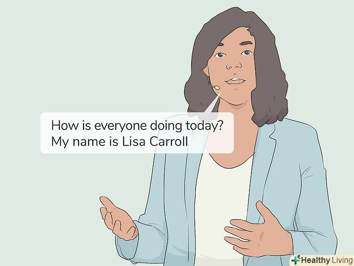 Привітайте аудиторію і назвіть своє ім'я. якщо ви виступаєте з промовою, важливо назвати своє ім'я та прізвище. Коли ви вітаєте всіх і представляєтеся, обов'язково говорите чітко і впевнено.- Скажіть: "Добрий день, я [ім'я] [прізвище]"» Або: "як у вас справи сьогодні? Мене звуть [ім'я] [прізвище]"»
