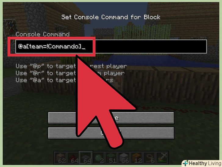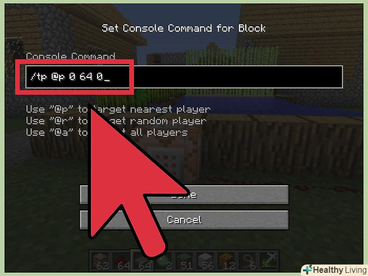 - Ви можете замінити» @p " на інший параметр. Якщо ви введете ім'я Користувача, буде телепортований саме цей користувач, навіть якщо хтось інший активує блок. Якщо ви введете» @r", буде телепортований випадковий гравець.