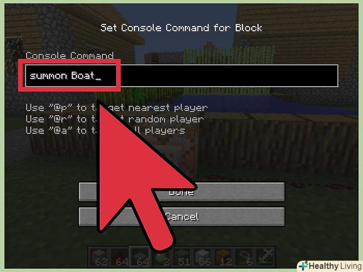 Створення (виклик) предметів або блоків. якщо ви використовуєте Minecraft 1.7 (або пізнішу версію), ви можете робити командні блоки, що створюють предмети або блоки. Ось деякі приклади:- При активації командного блоку з командою "summon Boat" поруч з блоком буде з'являтися човен. Гравцям більше не потрібно чекати порома.