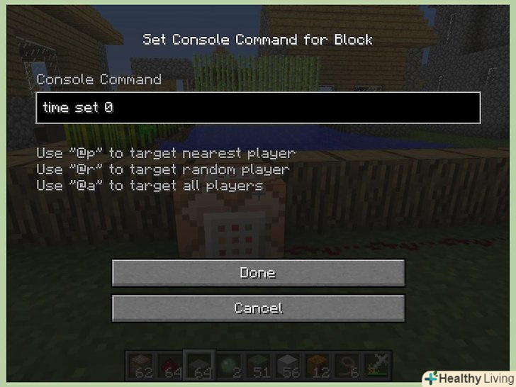 - Натисніть "Готово", щоб зберегти команду в командному блоці. Якщо ви закриєте вікно, натиснувши Esc, команда не збережеться.