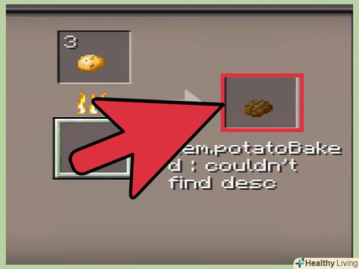 Помістіть картоплю в піч, щоб запекти його. щоб підвищити ефективність картоплі, потрібно спочатку його приготувати. Покладіть картоплю в піч (як при плавленні або готуванні м'яса) і дайте йому пропектися протягом однієї-двох хвилин. За підсумком у вас виявиться новий предмет: печена картопля. Його харчова цінність куди вище, ніж у сирої картоплі – він відновлює три повних серця. [4]