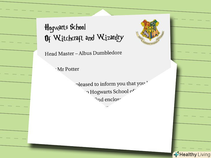 Почніть писати лист.якщо ви не знаєте, що саме потрібно написати, знайдіть том першої книги серії на полиці або в Інтернеті і скопіюйте текст листа. Використовуйте смарагдовий колір шрифту: лист, отриманий Гаррі Поттером, був написаний смарагдово-зеленим чорнилом на пергаментному папері.- Замість адреси, зазначеної в листі Гаррі, напишіть адресу друга, а замість "комірчини під сходами" вкажіть опис його кімнати, наприклад, "захаращений куточок" або "кімнатка без вікон".