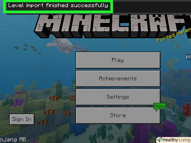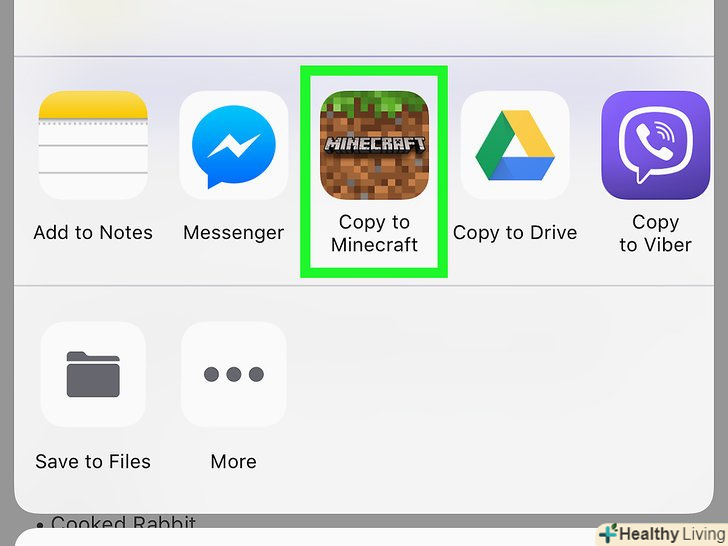 Проведіть пальцем і натиснітьCopy to Minecraft (Копіювати в Minecraft). ця опція знаходиться у верхньому ряду опцій. Відкриється Minecraft PE.- Якщо опції «Minecraft» немає в меню, прокрутіть вправо, Натисніть "More «(ще) і торкніться білого перемикача праворуч від опції»Minecraft".