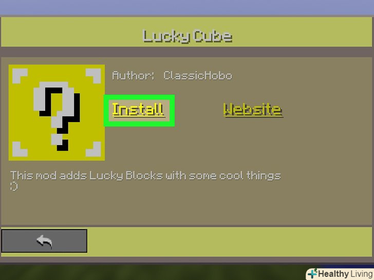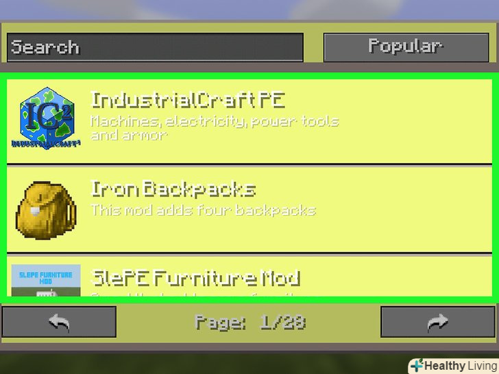 Знайдіть мод. перегляньте список доступних модів або натисніть на значок у вигляді лупи в нижній частині екрана і введіть ім'я або опис мода. Коли ви знайдете мод, торкніться його імені, щоб відкрити його сторінку.- Майте на увазі, що моди для iOS-версії Minecraft менш цікаві, ніж для Android-версії і комп'ютерної версії.
