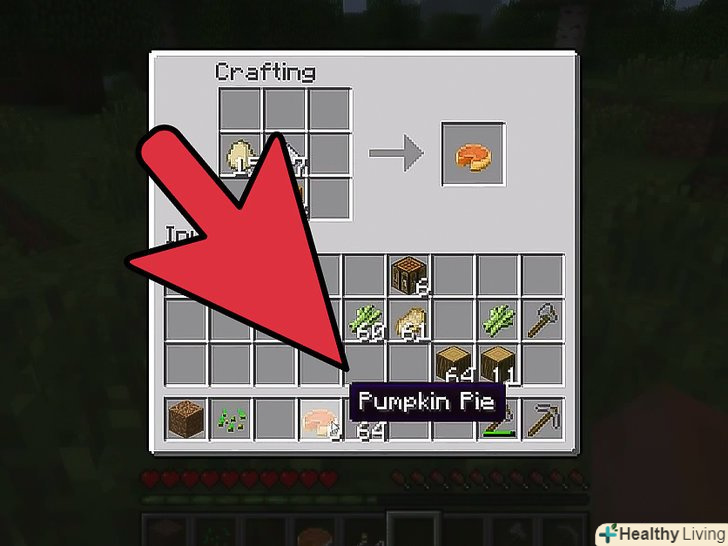 Гарбузовий пиріг-це хороша їжа в Minecraft. Він відновлює 8 очок голоду, а інгредієнти легко виростити. Щоб зробити гарбузовий пиріг, вам знадобляться гарбуз, яйце і цукор.
