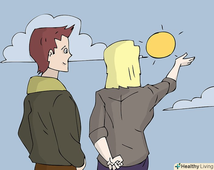 Поговоріть про погоду. не можна зіпсувати розмову нешкідливими коментарями про погоду або про щось щоденне. Зробіть комплімент про те, як сонячно/вітряно/дощово. Так у вас з'явиться безпечна тема для того, щоб розтопити лід. Як тільки він відповість, можна перейти до більш захоплюючим темам.- Намагайтеся бути позитивною, а не скаржитися, навіть якщо за вікном ллє дощ. Хлопцям подобаються веселі, усміхнені дівчата.