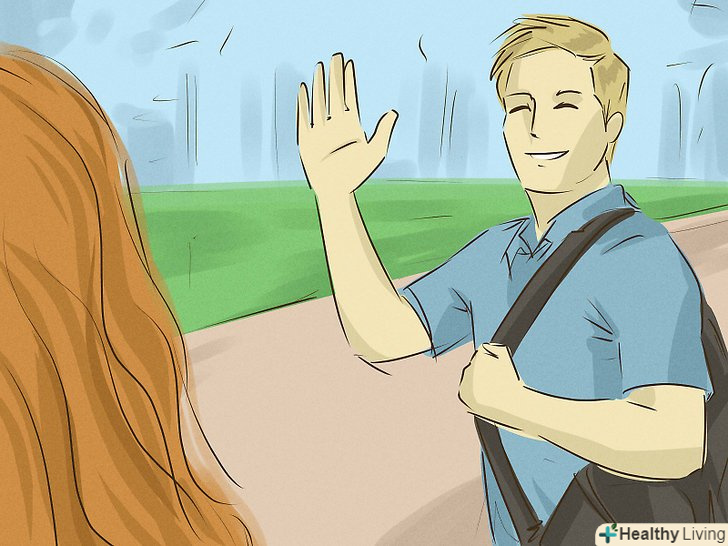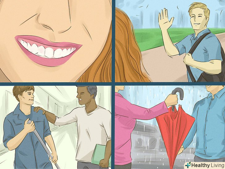 Посміхайтеся. посміхаючись, ви показуєте людям, що вам приємно. Подивіться людині в очі і подаруйте йому невелику посмішку або широку посмішку — неважливо, яку. Це створює настрій випадкової зустрічі і, як правило, заохочує людину посміхнутися у відповідь. Крім того, так людина відчує себе комфортно в компанії з вами. Якщо людина не посміхнеться у відповідь, не переживайте, можливо, у нього був поганий день.- Посміхайтеся випадковим перехожим на вулиці, коли купуєте щось в магазині, коли вранці йдете в школу або в будь-який інший раз, коли зустрічаєтеся очима з ким-небудь.
