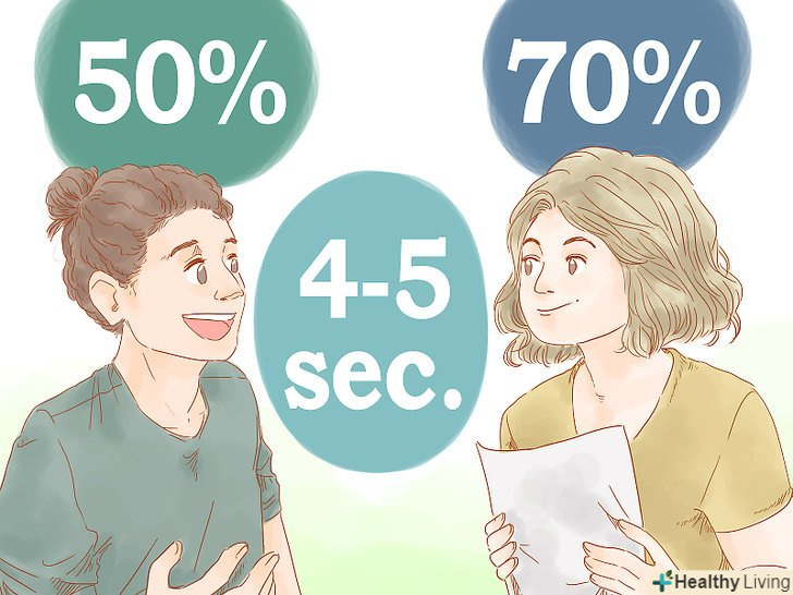 - Задайтеся метою підтримувати зоровий контакт зі співрозмовником протягом 50% часу, коли говорите, і 70% часу, коли слухаєте. Перш ніж відводити очі, затримуйте погляд на 4-5 секунд. [18]