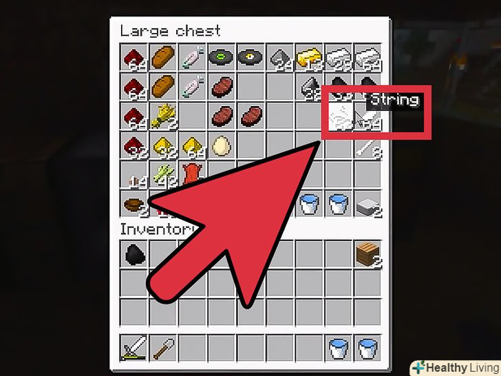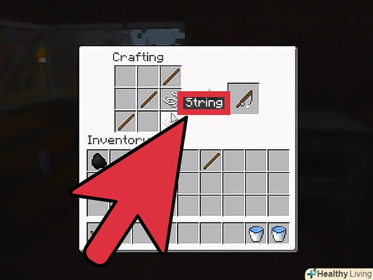 Покладіть три палиці і дві нитки на верстак:- Одну палицю в центральний слот, одну в верхній правий слот, одну в нижній лівий слот.
