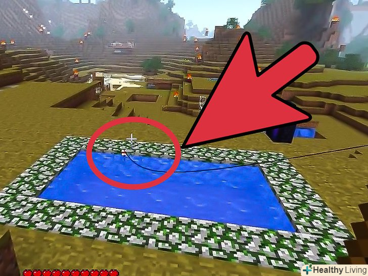 Візьміть вудку в руки, натисніть правою кнопкою миші по воді.натисніть ще раз, щоб змотати вудку, коли буде клювати риба.- Вудку можна закидати, коли ви перебуваєте під водою.