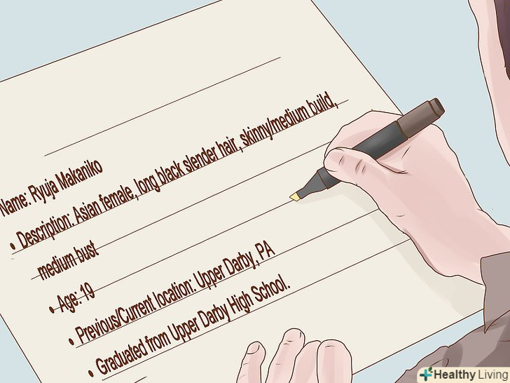 Проаналізуйте всю інформацію. на аркуші паперу напишіть все, що Ви знаєте про людину. Але ви не повинні писати марну інформацію, типу»на ній був чорний браслет в останній раз, коли я її бачила". Чим це допоможе вам? Нічим! Який раси / Походження ваш друг? Де він живе? Якої довжини у нього волосся? Ось приклад опису:- Ім'я: Ryuja Makaniko