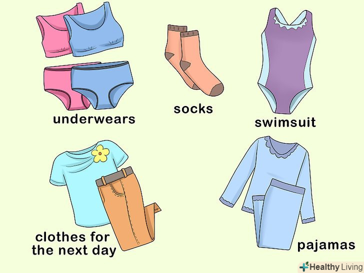 Підготуйте одяг, який вам знадобиться. подбайте про те, щоб у вас був необхідний одяг. Вам буде не дуже комфортно, якщо у вас не буде необхідного одягу. Тому візьміть все, що вам знадобиться. Обов'язково візьміть з собою: [2]- Нижня білизна-візьміть додаткову пару на всякий випадок;