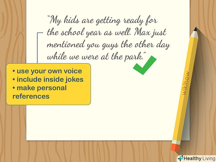 Підтримуйте розмовний тон протягом усього листа. Текст листа повинен відображати ваш стиль спілкування. При бажанні можна використовувати сленг, жарти для своїх, посилатися на спільних знайомих. [9]- Тон листа повинен відповідати обраній темі. Якщо ви пишете про веселу подорож у відпустці, то використовуйте радісний тон. Якщо ж висловлюєте співчуття, то будьте серйозні і проявіть турботу.