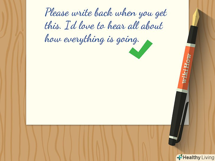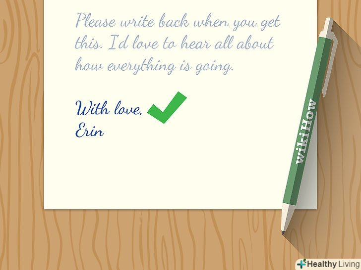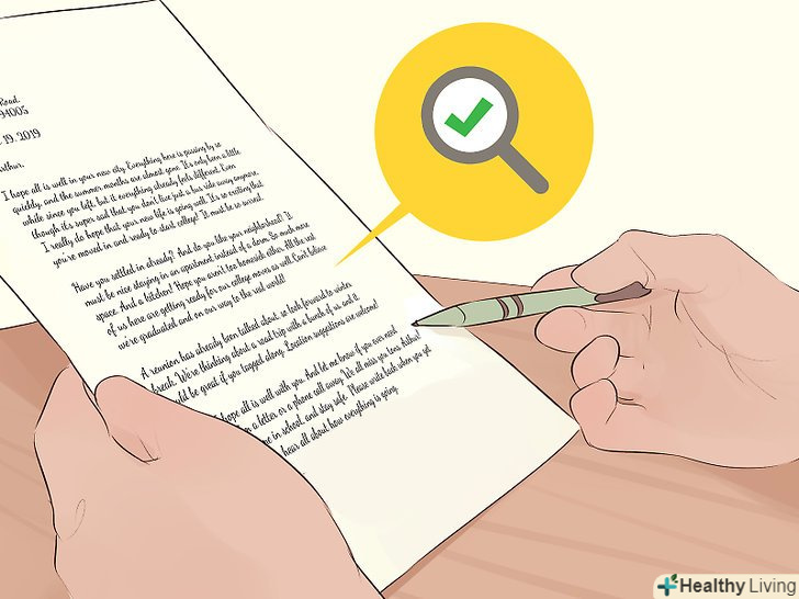 Перечитайте лист і виправте помилки. коли завершите лист, візьміть невелику перерву і потім перечитайте текст В пошуках граматичних або орфографічних помилок. Якщо у вас немає зайвого часу, то можна надрукувати лист на комп'ютері і включити перевірку правопису в текстовому редакторі. [12]- Також важливо переконатися, що лист логічно і послідовно. Пам'ятайте, що в листі важко передати настрій і настрій, тому переконайтеся, що всі ваші слова зрозумілі.
