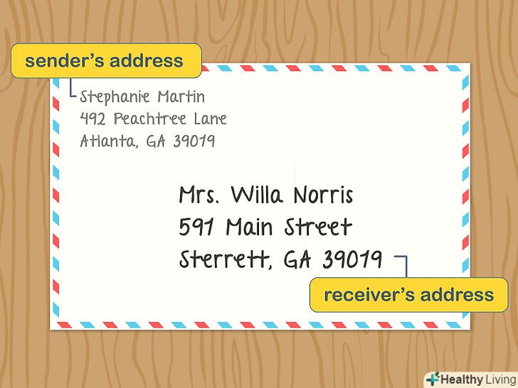 Напишіть адресу відправника та одержувача на конверті. вкажіть ім'я та прізвище друга в правому нижньому кутку. Далі напишіть вулицю, номер будинку і квартиру. Потім вкажіть населений пункт і область, а також Індекс. Свою адресу в такому ж форматі напишіть в лівому верхньому кутку конверта. [13]- Якщо друг живе в іншій країні, то не забудьте вказати назву країни в адресі.