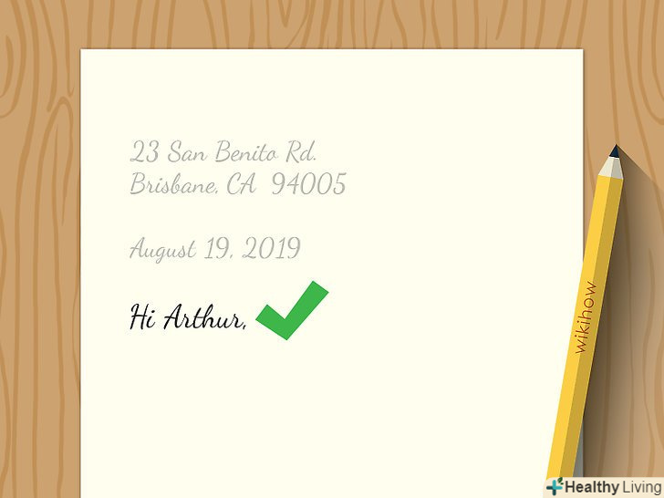 Використовуйте неофіційне привітання. лист другу не повинно бути надмірно діловим. Зверніться до людини на ім'я або використовуйте дружні слова. Привітання може виражати радість або хвилювання. Приклад: [4]- Здрастуй, Женя!