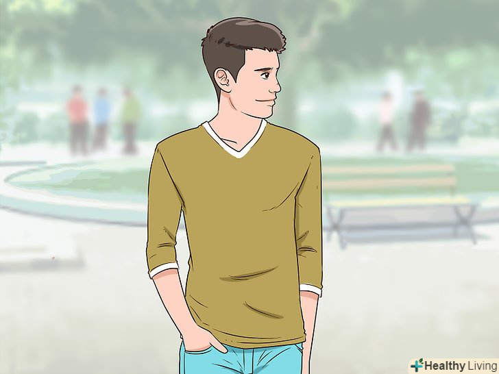 Демонструйте впевненість за допомогою мови тіла. стаєте господарем становища, коли ви входите в приміщення! Тримайте голову прямо, пересувайтеся великими кроками, дозвольте рукам вільно розгойдуватися уздовж тулуба. Займайте якомога більше простору в положенні стоячи або сидячи! Коли сидите, впирайтеся ліктями в крісло і трохи розсуньте ступні. Тримайте спину прямо і дивіться в очі, коли розмовляєте з людьми. [1]- Пам'ятайте, що впевненість важлива в першу чергу для вас, а потім вже для всіх інших.