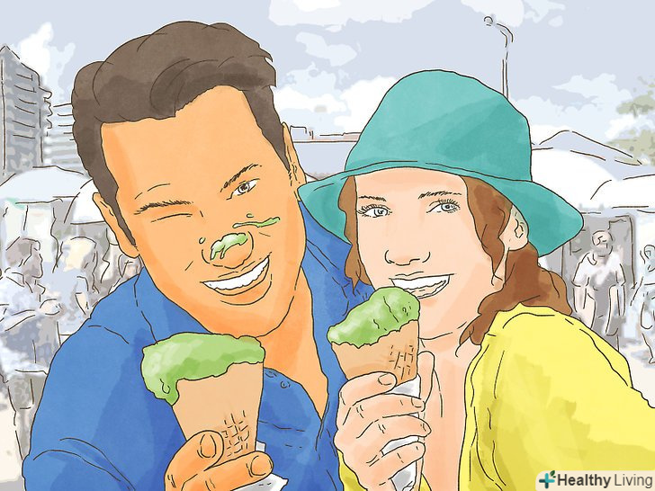 Пограйте з їжею. коли будете пекти печиво на кухні зі своїм хлопцем, подуйте трохи борошна йому на ніс. Після того, як він подує борошном у відповідь, киньте в нього пару шоколадних чіпсів. І нехай почнеться битва їжею!- Зіграйте в ловлю їжі: ви кидаєте хлопцеві кілька мармеладок або виноградинок, а він повинен зловити їх ротом.