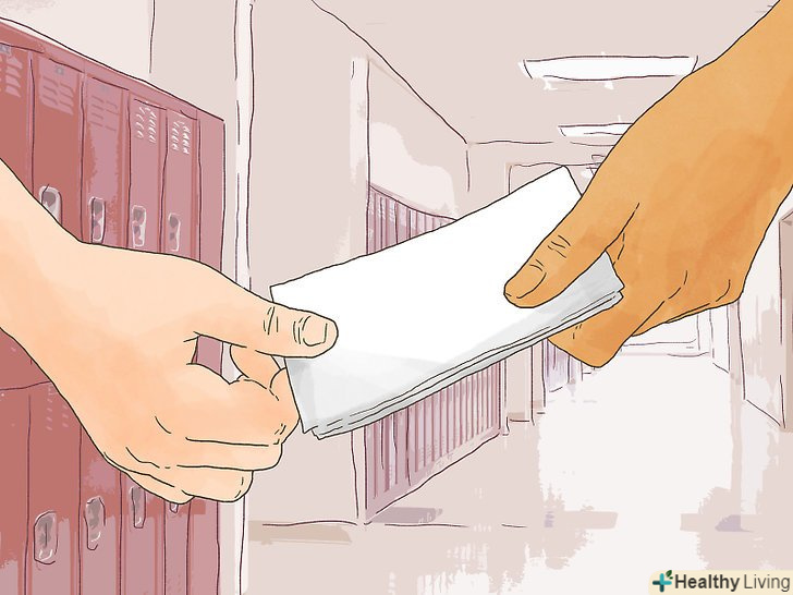Доставте її обранцеві. можна передати записку особисто або залишити її в шафці одержувача (якщо у вас в школі є шафки). Можна також попросити друга передати записку, але щоб він обов'язково уточнив, від кого вона, щоб уникнути плутанини. Було б непогано почекати до обіду або закінчення уроків, щоб передати записку, щоб ні ви, ні одержувач не потрапили в неприємності під час заняття.- Можливо, краще почекати, поки людина залишиться один, і передати записку, щоб він міг прочитати її без зайвих очей.