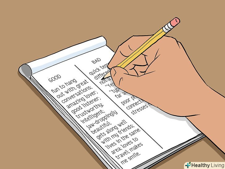 Складіть список. кожній дівчині відведіть окрему колонку і перерахуйте якомога більше її позитивних якостей. Якщо ви виявили якісь якості, якими володіють обидві дівчини, викресліть їх зі списку. Уважно погляньте на унікальні якості і порівняйте, які з них вам подобаються більше. Дівчина з найбільшою кількістю хороших унікальних характеристик цілком може бути тією, яку вам варто вибрати. Можна також скласти список негативних якостей, в такому випадку вам варто вибрати дівчину з найменшою кількістю негативних характеристик.- До позитивних якостей можуть ставитися: цікаве проведення часу, глибокі бесіди, дивовижна коханка, хороший слухач, заслуговує довіри, розумна, неймовірно красива, добре ладнає з вашими друзями, живе в тому ж районі, любить подорожувати, змушує вас посміхатися.