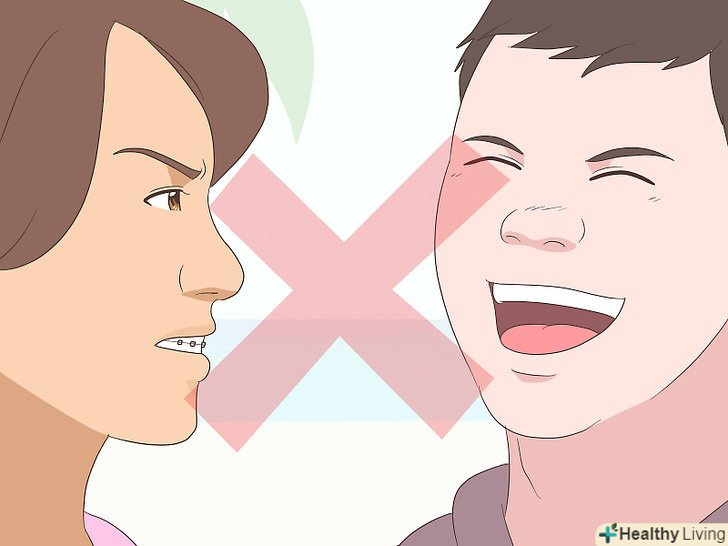 Не висміюйте людину зі скобами. якщо Ви зайшли на цю сторінку, тому що ваш партнер по поцілункам був недавно наділений брекетами, ви повинні бути надзвичайно делікатні до його або її ситуації. Ніяких жартів як "brace face "або" metal mouth", якщо ви не хочете табу на Ваші спільні поцілунки. Ваш партнер, ймовірно, дуже сприйнятливий і відчуває себе досить свідомим; ваша робота зробити все, щоб йому або їй було краще, а не гірше.- Якщо у вас обох є брекети, це чудово! Можете сміятися над цим разом.