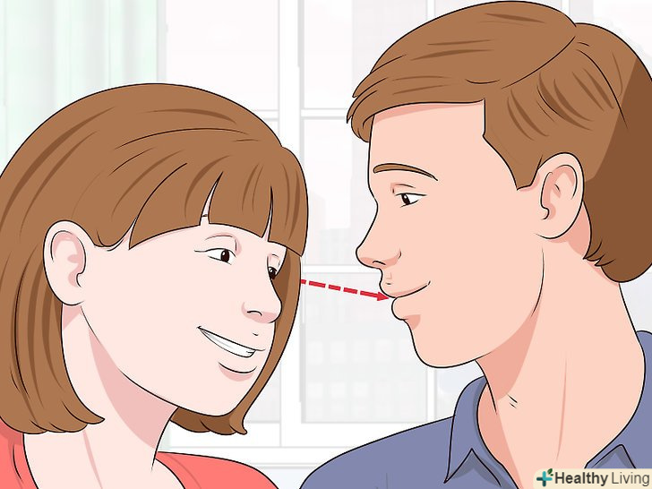 Ковзайте поглядом по губах вашого партнера. як тільки ви встановите зоровий контакт, можете дозволити своїм очам блукати, щоб далі натякнути, що хочете поцілунку. Подивіться людині в очі, а потім пройдіть побіжним поглядом по його губах. Не потрібно пильно на них дивитися. Затримайте погляд на губах на пару секунд, а потім відновіть зоровий контакт. [14]