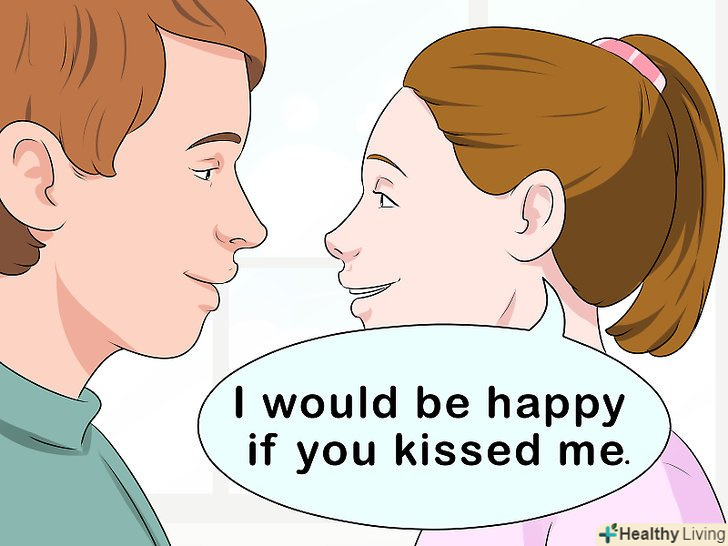 Скажіть партнеру, що не проти, щоб він вас поцілував. найпростіший спосіб поцілуватися — це сказати своєму партнерові, що ви до цього готові. Вам не потрібно вимагати поцілунків. Просто дайте йому зрозуміти, що ви відкриті до цього і будете раді це зробити. [16]- Можна просто сказати: "мені буде приємно, якщо ти мене поцілуєш".