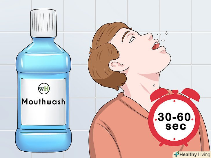 Полощіть рот спеціальним засобом. попрацювавши з зубною ниткою, використовуйте засіб для полоскання рота, наприклад, Listerine. Зубна нитка видалить частинки їжі, а засіб для полоскання рота Змиє їх залишки. Полощіть рот протягом 30-60 секунд (на свій розсуд), а потім спльовуйте. Повторюйте цю процедуру після кожного використання зубної нитки. [3]- Ви також можете носити з собою засіб для полоскання рота невеликого розміру (варіант для подорожей), щоб швидко освіжити дихання на ходу.