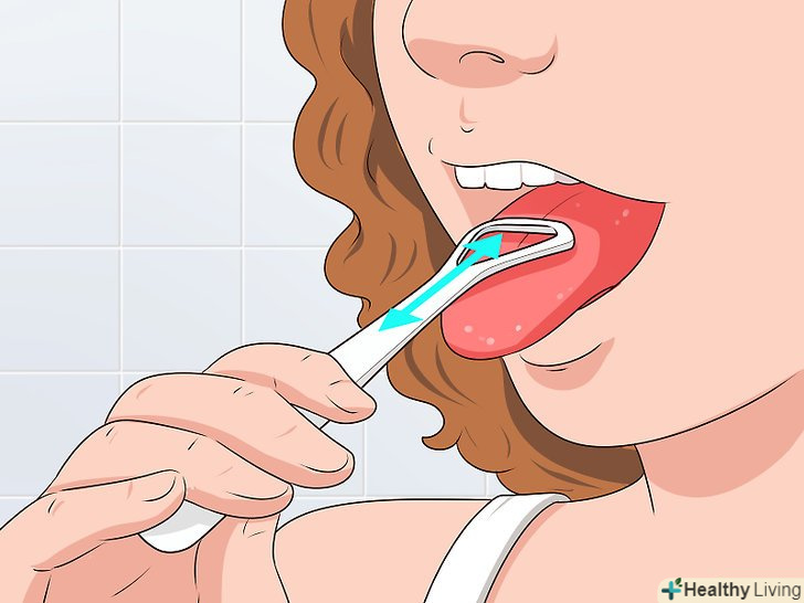 КористуйтесяСкребком для мови . скребок для язика-це пластиковий або металевий інструмент, яким потрібно водити по язику, щоб видаляти омертвілі клітини і бактерії, що викликають погане дихання. Прикладіть скребок до мови і водите їм взад-вперед приблизно 10-20 секунд. Повторюйте один раз ввечері, після чищення зубів. [4]- На деяких зубних щітках є скребок для язика на задній частині головки.