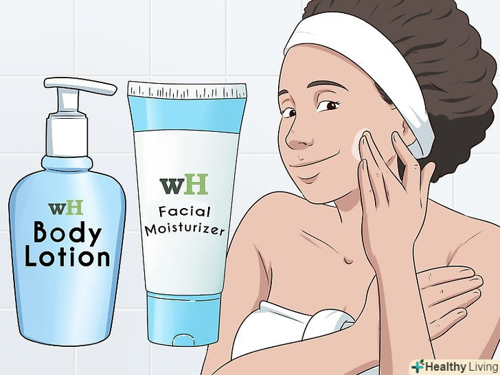 Зволожуйте шкіру після душу, щоб вона була м'якою. розітріть лосьйон по всьому тілу і обличчю після виходу з душу. Ви можете використовувати різні види зволожуючих засобів на обличчі і на тілі. Регулярне зволоження збереже шкіру м'якою і приємною на дотик. [7]- Деякі лосьйони можуть бути занадто жорсткими для використання на обличчі, тому, як правило, краще використовувати зволожуючий крем, спеціально розроблений для цієї області.
