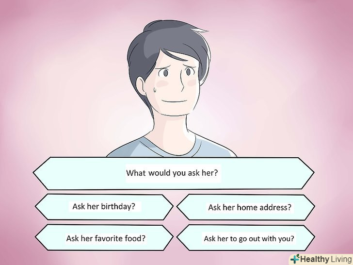 Не думайте занадто багато, що сказати на початку. багато хлопців бояться наближатися до жінок, тому що вони просто не можуть придумати, що сказати в першу чергу. Як щодо: "Привіт, я Марк - Як тебе звуть?"Скоріше, дівчина буде вражена вашою здатністю діяти недбало і природно – замість того, щоб старанно намагатися справити на неї враження продуманою пікаперською фразою або надмірно розумним коментарем. Ставтеся до цього, як до будь-якого іншого розмови-крім того, що у цього є романтичні перспективи.- Подивіться їй в очі, скажіть їй, хто ви, і запитайте її ім'я. Якщо вона з друзями, поговоріть з ними теж, щоб вони не відчували себе обділеними.