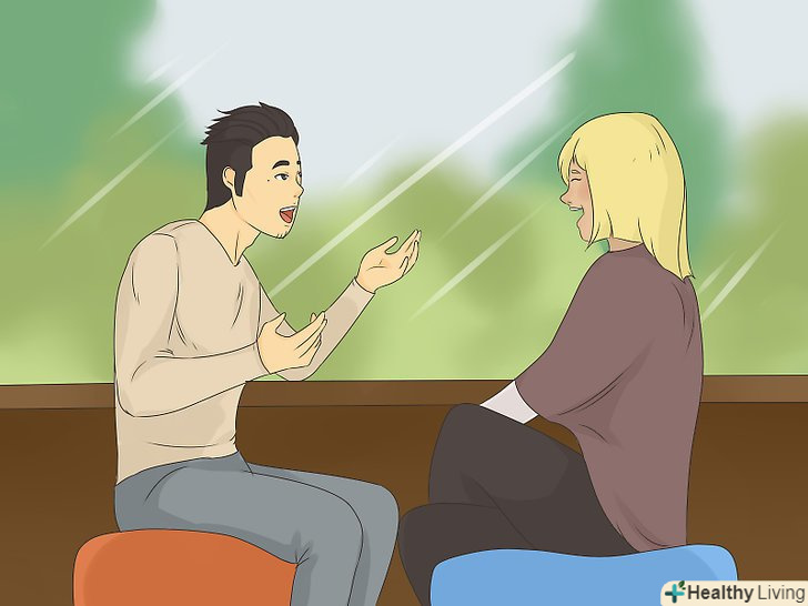 Будьте позитивні. посміхніться і не бійтеся дивитися на неї, поки вона говорить. Згадайте стару приказку:»смійтеся — і весь світ буде сміятися з вами; плачте — і ви будете плакати один". Ми виробляємо найкраще враження, коли робимо оточуючих щасливими. [5]- Залиште серйозні та сумні теми для інших розмов. Якщо така тема підніметься (наприклад, якщо вона запитає вас про когось, хто недавно помер), будьте чесні, але не дозволяйте розмові розвиватися в цьому напрямку.