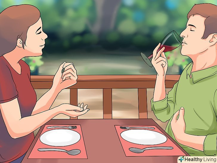 Нехай все буде невимушено і весело. Якщо ви проводите день за екстремальним заняттям, як, наприклад, скелелазіння, а сісти десь за вечерею здається занадто офіційним або дорогим, влаштуйте невимушену трапезу. Можна взяти ланч або вечерю в продуктовому фургоні або купити сендвічі в буфеті поруч з пляжем. Зв'яжіть трапезу з заняттям, яке ви запланували.- Якщо весь день ви збираєтеся провести активно, подумайте про пікнік. Щоб зробити його особливим, захопіть ще пляшку шампанського або вина.