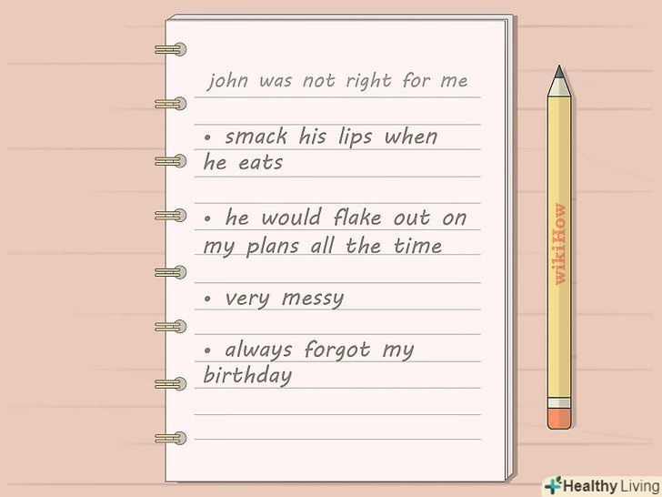 Знайдіть підтвердження, що людина вам не підходить. складіть список негативних якостей людини і причин, за якими ви не підходите один одному. З чого почати? Наприклад, людина не поділяє ваших почуттів. У такій ситуації неможливо побудувати міцні відносини. [7] ви заслуговуєте бути з тим, хто хоче бути з вами.- Пишіть що завгодно, адже цей список побачите тільки ви. Можливо, людина облизує губи під час їжі і вас це дратує, завжди надходить по-своєму і не слухає інших. Записуйте!