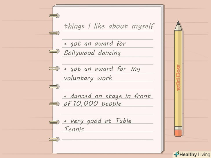 Складіть список своїх достоїнств. ваша самооцінка може постраждати після відмови, оскільки люди часто зациклюються на своїх уявних недоліках. Нерідко починає здаватися, що ми не подобаємося людині з однієї або іншої причини, що лише погіршує ситуацію. [14] зосередьтеся на своїх позитивних якостях, запишіть досягнення, добрі вчинки і гідності.- Зверніться за допомогою до друзів і рідних, якщо не вдається нічого придумати.