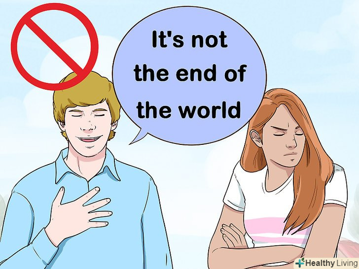 Не намагайтеся применшити її проблеми. якщо ви хочете, щоб дівчині стало краще, то найгірше, що ви можете сказати – це щось на зразок: "це не кінець світу" або "Все Буде Добре". Звичайно, ви можете розуміти, що вона засмучена через щось незначне, наприклад, через погану оцінку по контрольній або розриву з невдахою, з яким вони зустрічалися всього пару тижнів, але вам не варто говорити їй про це, інакше їй стане тільки гірше. Зараз вона хоче просто посумувати і розповісти про свої почуття, а не чути, що нічого страшного не сталося.- Вам може здаватися, що Ви допомагаєте їй, показуючи їй перспективу, але ви тільки засмучуєте її ще більше, і вона може відвернутися від вас.