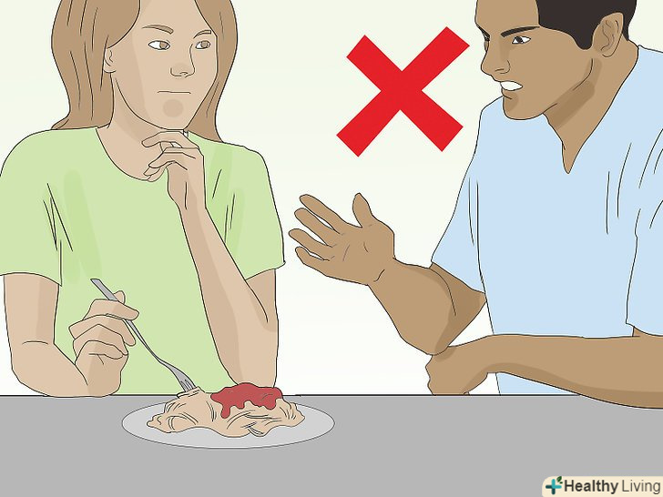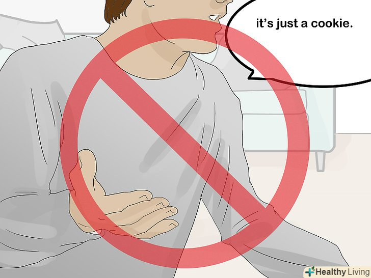 Скажіть партнеру, щоб він не контролював ваші харчові звички. Ваш партнер може вважати, що для того щоб допомогти вам, він повинен пильно стежити за тим, що саме ви їсте. Тобто не стежити за тим, скільки в будинку їжі і скільки їжі ви вживаєте за прийом їжі. Така тактика більше шкодить, ніж допомагає, оскільки викликає почуття провини і сорому, які в свою чергу можуть стати причиною деструктивної поведінки. [13]- Попросіть партнера не коментувати ваші звички в їжі. Це може спровокувати у вас нездорову поведінку.